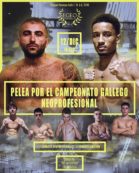 Por primera en mucho tiempo el Entrenador, boxeador y organizador, Carlos García Cal, deja a un lado las clásicas sedes del Frontón de Riazor o el Polideportivo del Barrio de las Flores, para organizar en su Escuela de Boxeo y de Entrenamiento Personalizado Egeo Cross Boxing, ubicada en el Polígono Comercial de Mayoristas Coruñeses -POCOMACO Calle 1, 10, G-6, 15190-.